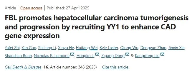 [1] Zhi Y, Guo Y, Li S. et al. FBL promotes hepatocellular carcinoma tumorigenesis and progression by recruiting YY1 to enhance CAD gene expression. Cell death & disease. 2025, 16: 348.原文链接:https://doi.org/10.1038/s41419-025-07684-z