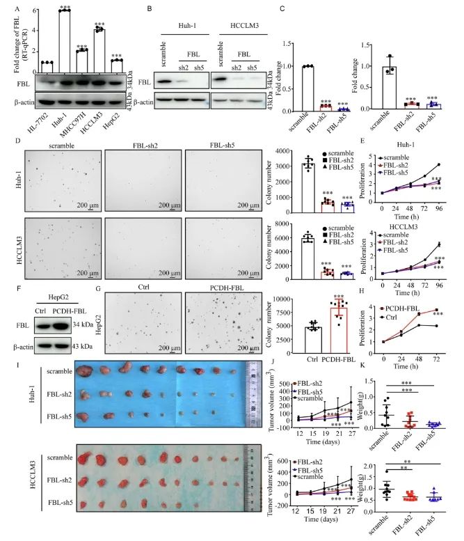 FBL在体内外均可促进肝癌细胞增殖。研究人员评估了正常人肝细胞系(HL-7702)和肝细胞癌(HCC)细胞系中FBL蛋白和mRNA的水平。值得注意的是,HCC细胞系中的FBL表达高于HL-7702细胞系。鉴于Huh-1和HCCLM3细胞系中FBL表达水平较高,研究人员随后将分析范围限定在这两个细胞系。为了探究FBL在HCC增殖中的作用,研究人员利用靶向FBL的特异性shRNA建立了稳定的FBL敲低细胞。shFBL #2和shFBL #5均成功抑制了Huh-1和HCCLM3细胞系中的FBL表达。结果还显示,FBL敲低细胞的细胞生长和集落形成显著减少。相反,在HepG2细胞中过表达FBL导致细胞生长增加57.7%,集落形成增加71.1%。为了探究FBL在体内HCC肿瘤生长中的潜在作用,研究人员将FBL敲低细胞和对照细胞皮下注射到裸鼠体内。研究结果共同表明,FBL对肝细胞癌(HCC)癌细胞在体外和体内的生长均有促进作用。
