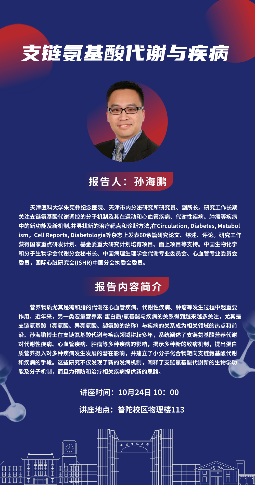 孙海鹏,天津医科大学朱宪彝纪念医院、天津市内分泌研究所研究员、副所长。研究工作长期关注支链氨基酸代谢调控的分子机制及其在运动和心血管疾病、代谢性疾病、肿瘤等疾病中的新功能及新机制,并寻找新的治疗靶点和诊断方法,在Circulation, Diabetes, Metabolism,Cell Reports, Diabetologia等杂志上发表60余篇研究论文、综述、评论。研究工作获得国家重点研发计划、基金委重大研究计划培育项目、面上项目等支持。中国生物化学和分子生物学会代谢分会秘书长、中国病理生理学会代谢专业委员会、心血管专业委员会委员,国际心脏研究会(ISHR)中国分会执委会委员。