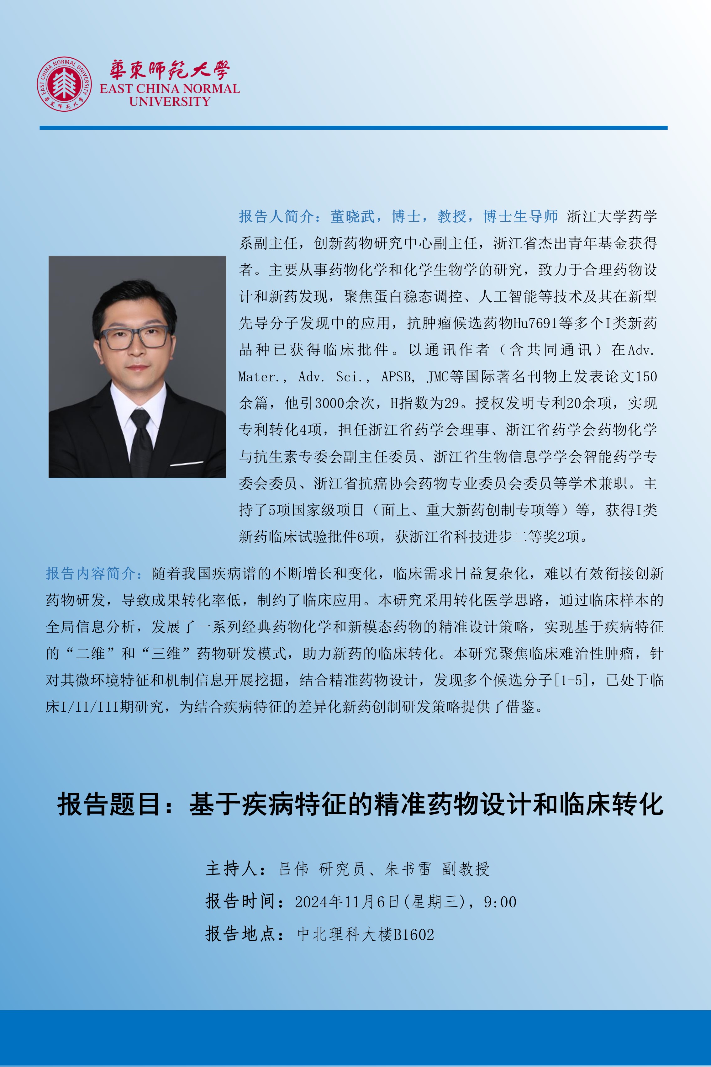 讲座通知丨董晓武:基于疾病特征的精准药物设计和临床转化